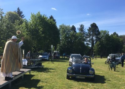 Nicht in der Stadtpfarrkirche, sondern auf den Ex-Sportplatz der SpVgg Weiße Erde an der Kolpingstraße fand der Gottesdienst am Feiertag Christi Himmelfahrt mit Fahrzeugsegnung statt.