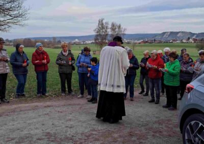 Bei bestem Wetter begrüßte Pfarrer Hofmann alle Teilnehmer des Lichterkreuzwegs. In Gedenken an das Wirken des heiligen Franz von Assisi, der vor 800 Jahren Lebensweisen angestoßen hat, die Menschen in Bewegung gebracht haben, hatte Pfarrer Hofmann einen „Franziskus-Kreuzweg“ ausgesucht, der großen Anklang fand.