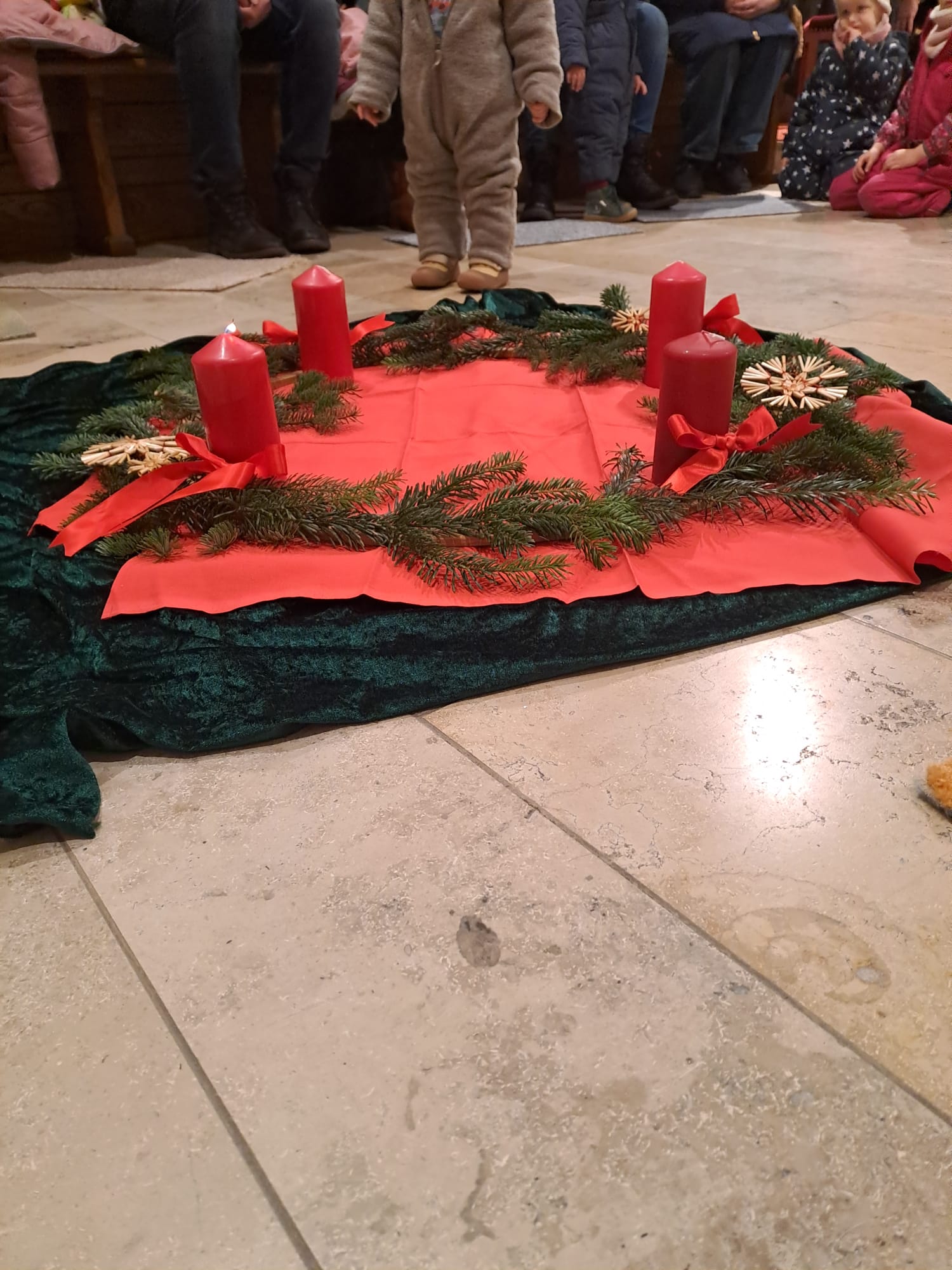 Am 29. November 2025 fand in der katholischen Pfarrkirche Mariä Himmelfahrt Hirschau eine besondere Veranstaltung für die Kleinsten statt: die „Kirche für Kleine im Advent“. Zu diesem Mitmach-Gottesdienst versammelten sich 25 Kinder im Kleinkind- und Kindergartenalter zusammen mit ihren Familien und Geschwistern. Im Mittelpunkt der Andacht stand der Adventskranz als Symbol für den Advent. Unter der Anleitung von Eltern-Kind-Gruppen-Leiterin Lisamarie Schmidl legten die Kinder in der Mitte der Kirche gemeinsam einen großen Adventskranz. Dabei erfuhren Kinder und Erwachsene die Symbolik der einzelnen Elemente: das immergrüne Tannengrün als Zeichen der Hoffnung, die roten Schleifen für Freude, die Kerzen als Lichtbringer in dunkler Zeit und die Strohsterne als Hinweis auf die Krippe in Bethlehem. Anschließend segnete Stadtpfarrer Johann Hofmann die von den Familien mitgebrachten Adventskränze und Kerzen. Mit dem eigenen Handumriss konnte jedes Kind zudem einen persönlichen Adventskranz aus Papier gestalten und als Andenken an diese besinnliche, stimmungsvolle Feier mit nach Hause nehmen.