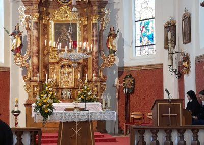 Pünktlich um 8 Uhr setzte sich der Pilgerzug aus der Pfarreiengemeinschaft Hirschau-Ehenfeld zum Mausberg in Bewegung. Zuvor hatte ihnen Stadtpfarrer Johann Hofmann den Pilgersegen gespendet. Zuerst auf dem Radweg, dann über gut ausgebaute Feldwege ging es dem Ziel, der Wallfahrtskirche auf dem Mausberg bei Gebenbach, entgegen. Nach gut eineinhalb Stunden ging es den Kreuzweg hinauf zum Gotteshaus auf dem Mausberg. Die Teilnahme am Festgottesdienst, den Pfarrvikar Christian Preitschaft zusammen mit Abt Beda Maria Sonnenberg von der Benediktinerabtei Plankstetten zelebrierte, bildeten Abschluss und Höhepunkt der Fußwallfahrt.